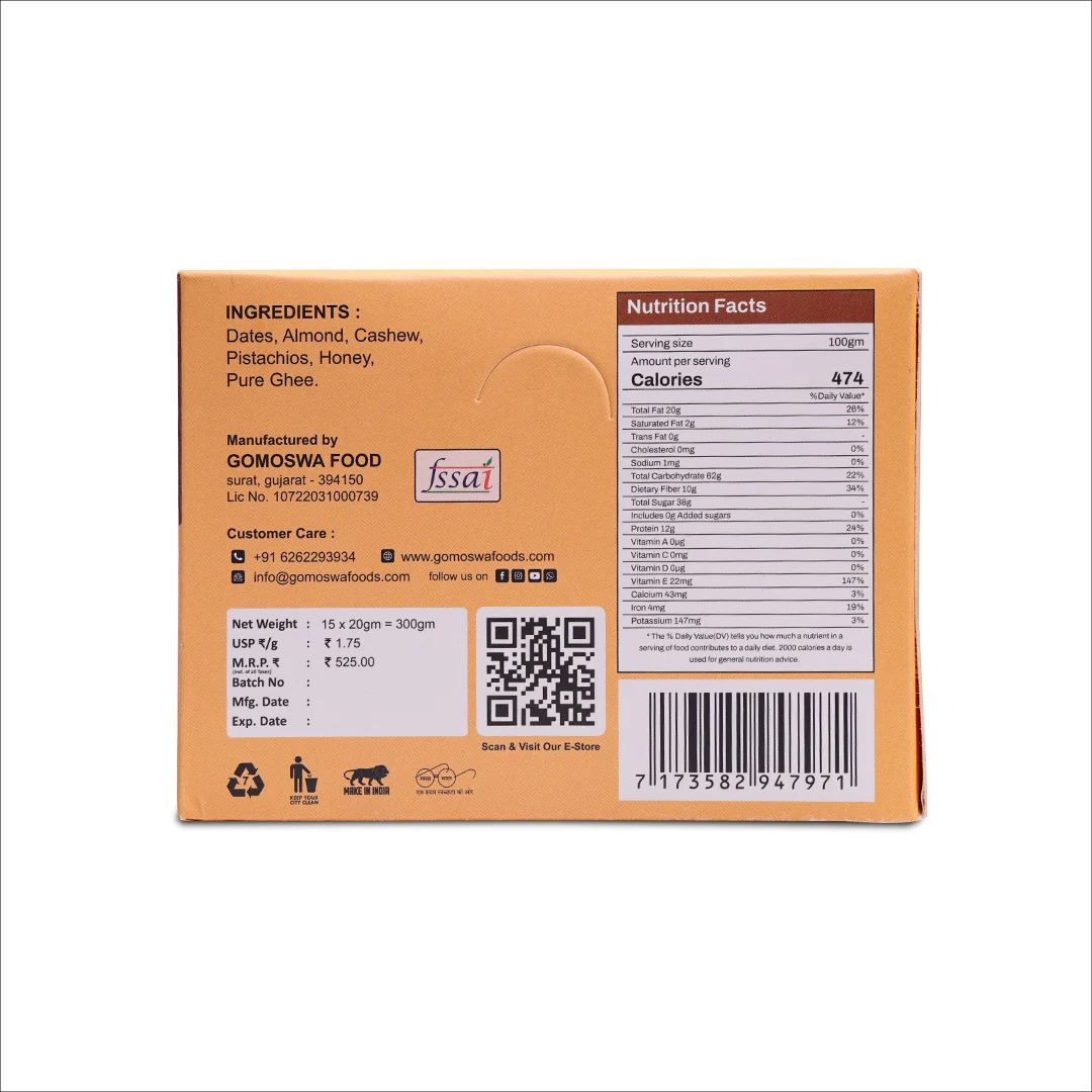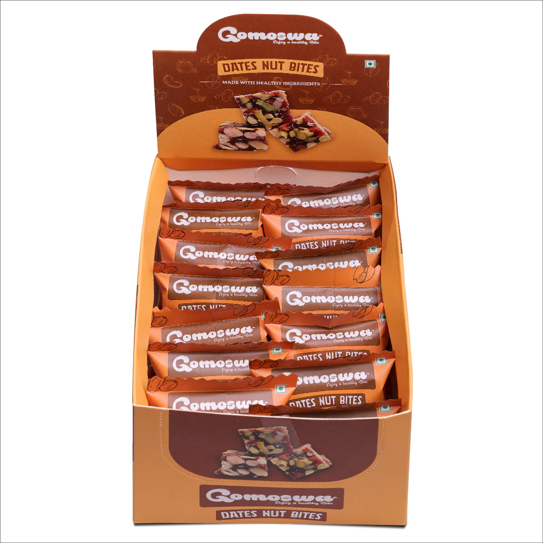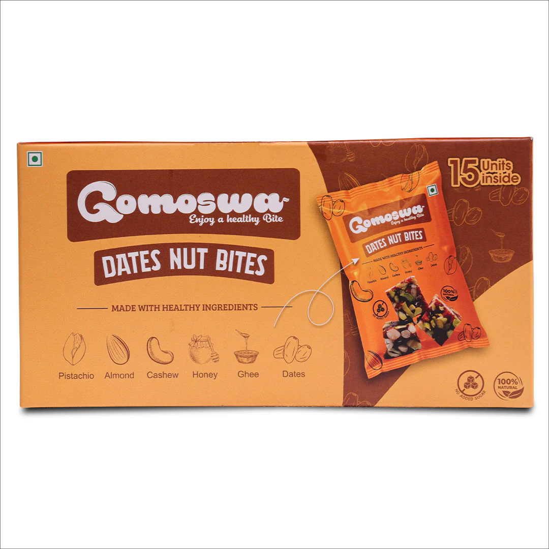 કાજુ, બદામ, ખજુર અને થોડી મધની કુદરતી તંદુરસ્તીથી ભરપૂર, ડેટ્સ નટ બાઈટ્સ એક સ્વાદિષ્ટ અને આરોગ્યપ્રદ નાસ્તો છે. દરેક બાઇટની ઉપર કુરકુરા પિસ્તાંજ્સ છે, જે તેને બનાવે પરફેક્ટ ફિનિશ. આ બાઈટ્સમાં છે સમૃદ્ધ સ્વાદ અને ઊર્જા, જે બનાવે તેને ગુલ્ટ-ફ્રી નાસ્તો, તહેવારની ભેટ, અથવા વ્યસ્ત દિવસ દરમિયાન ઝડપી ઊર્જા માટે પરફેક્ટ. દરેક બોક્સમાં 15 પીસ – સ્વાદ, પોષણ અને સુવિધાનું સચોટ મિશ્રણ.