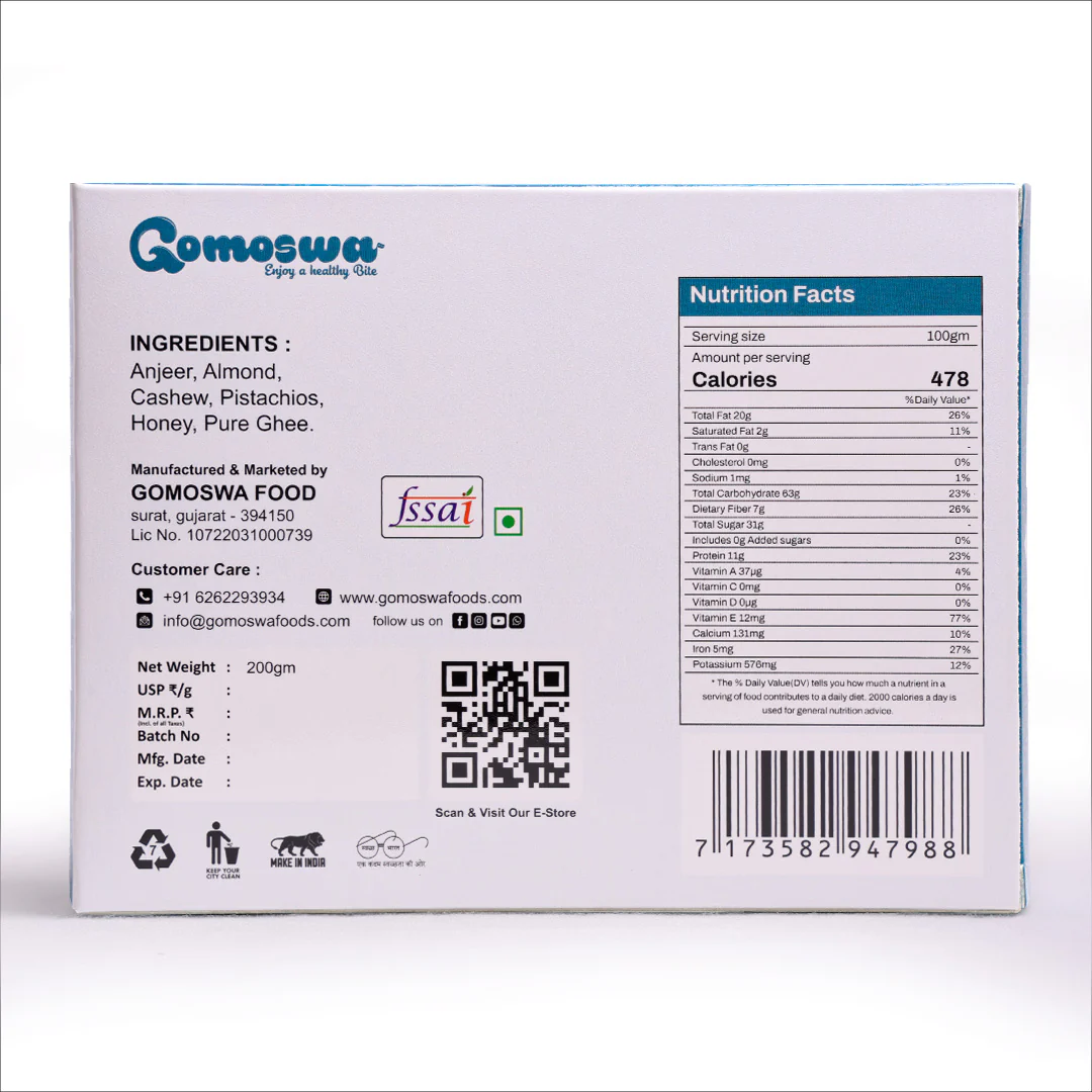 Dry fruit Anjeer Delights are a healthy, indulgent treat made with premium anjeer (figs), and a blend of roasted cashews and almonds. These delights are enriched with the richness of pure desi ghee and a touch of honey for natural sweetness. Garnished with pistachios, they offer a perfect balance of nutrition and flavor. Ideal for gifting or a wholesome snack, they provide a nutritious boost with every bite.